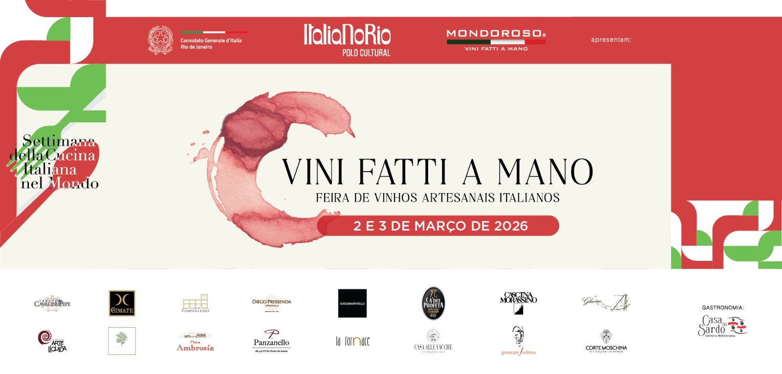 Nos dias 2 e 3 de março, o Polo Cultural recebe a Vini Fatti a Mano, uma feira–degustação com 14 importadores de vinhos italianos de alta qualidade, expressão autêntica de território, tradição e produção artesanal.